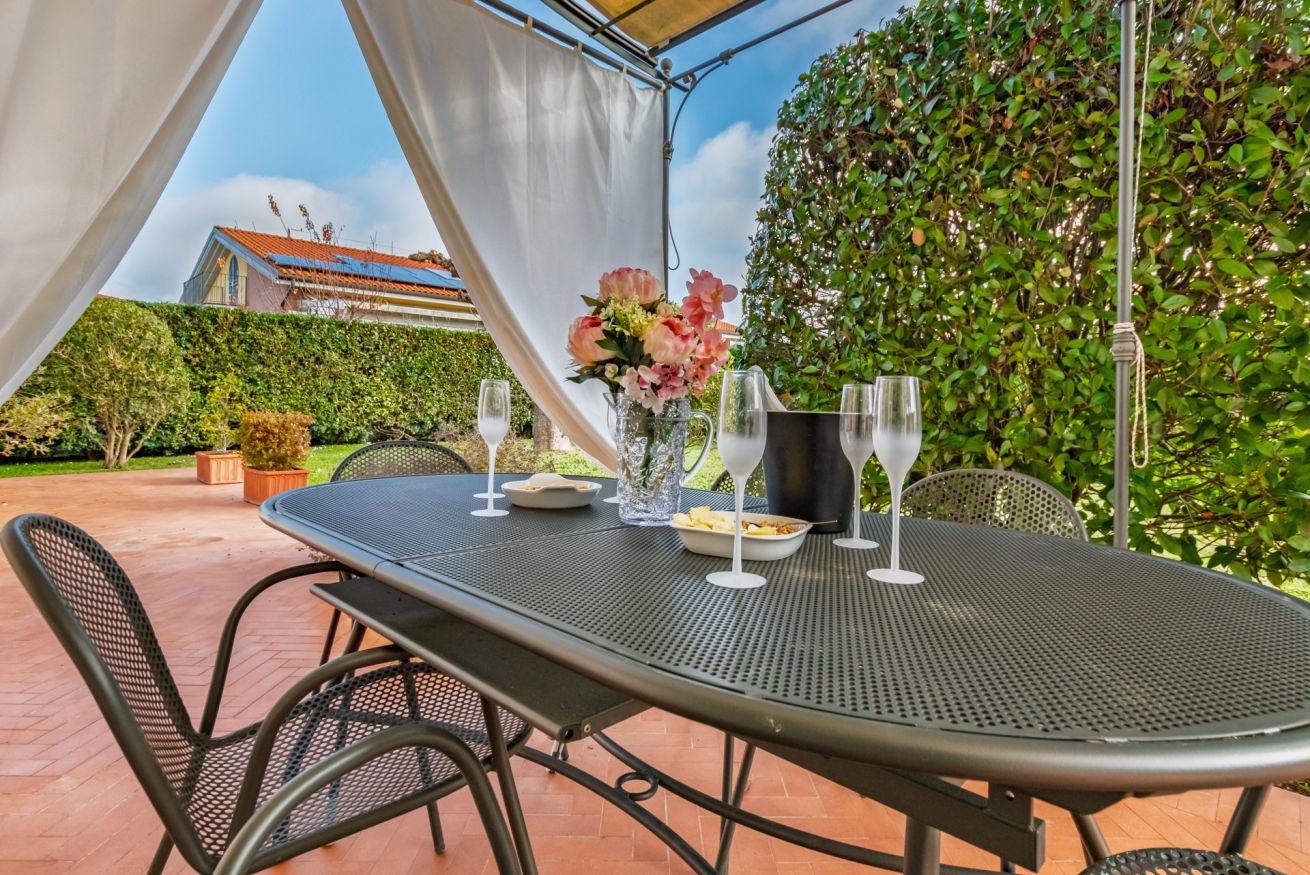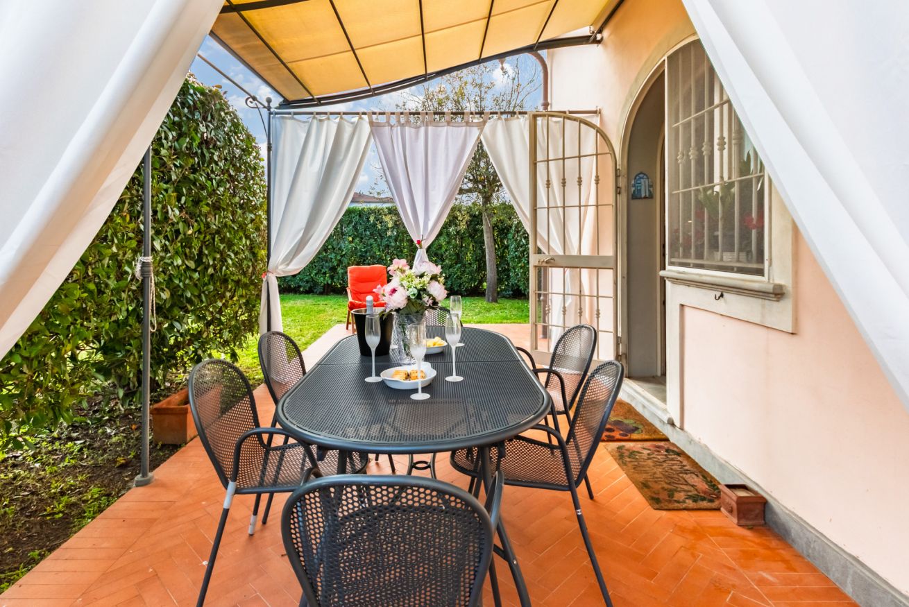 La casa dispone di un giardino privato e di una veranda arredata, perfetti per rilassarsi all’aperto in totale tranquillità.